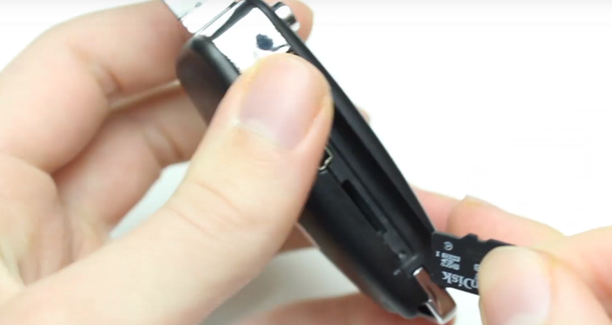 Une fois le produit chargé, insérez la carte mémoire (de 8 à 32 Go et de 64 à 128 Go en format FAT et non ExFat) en savoir plus. Vous devez insérer la carte mémoire micro SD (vierge d’une capacité allant jusqu’à 128 Go) avant d’allumer la caméra. Aidez-vous d’un stylo jusqu’à entendre le clic. Attention au sens d’insertion !