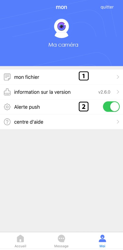 1- L’onglet « mon fichier » vous donne accès à vos enregistrements photos et vidéos effectués depuis l’application.