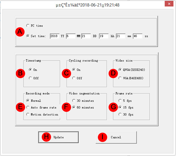 A : réglage de la date et heure (PC Time = heure actuelle / Set Time = réglage manuel de l’heure)
