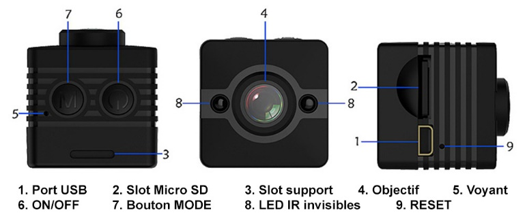 MODE VIDÉO 1080P voyants rouge et bleu | Appuyez sur le bouton (ON OFF)