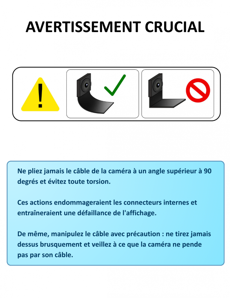 • Ne pliez pas le câble à angle vif, ne le coincez pas dans une porte, une chaise, etc.