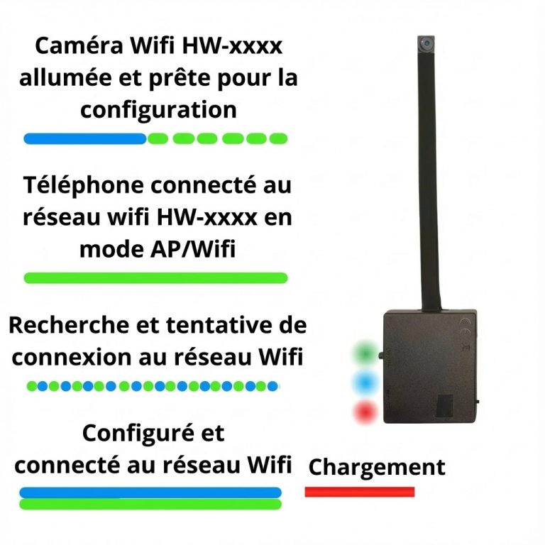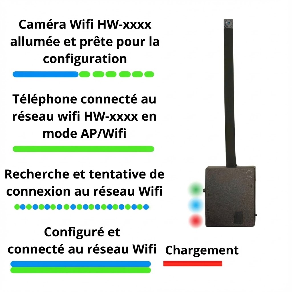 Bleu (fixe) et Vert (clignotant) Mode Prêt / Point d’accès (AP) : La caméra est allumée, réseau Wi-Fi **HW-xxxx** actif, prête pour la configuration.